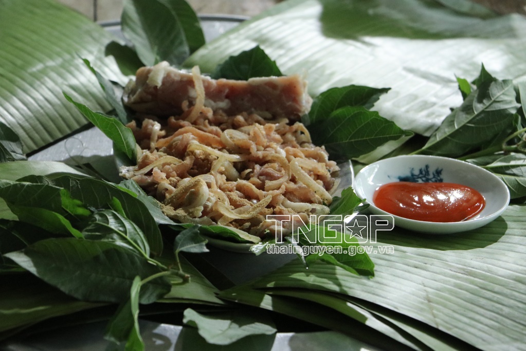 After wrapping, fermented pork rolls take 3-4 days to be ready for eating. Before serving guests, Van Yen people often grill the fermented pork rolls over a wood fire or roll it on a hot pan. When the outer layer is opened, the heat trapped in the grilled fermented pork rolls is released, emitting the fragrance of meat, spices, and the natural scent of guava and banana leaves. Locals also skillfully prepare fig leaves, Polyscias fruticosa leaves, chili sauce, and sprinkle roasted rice powder evenly on the fermented pork roll plate before serving guests.